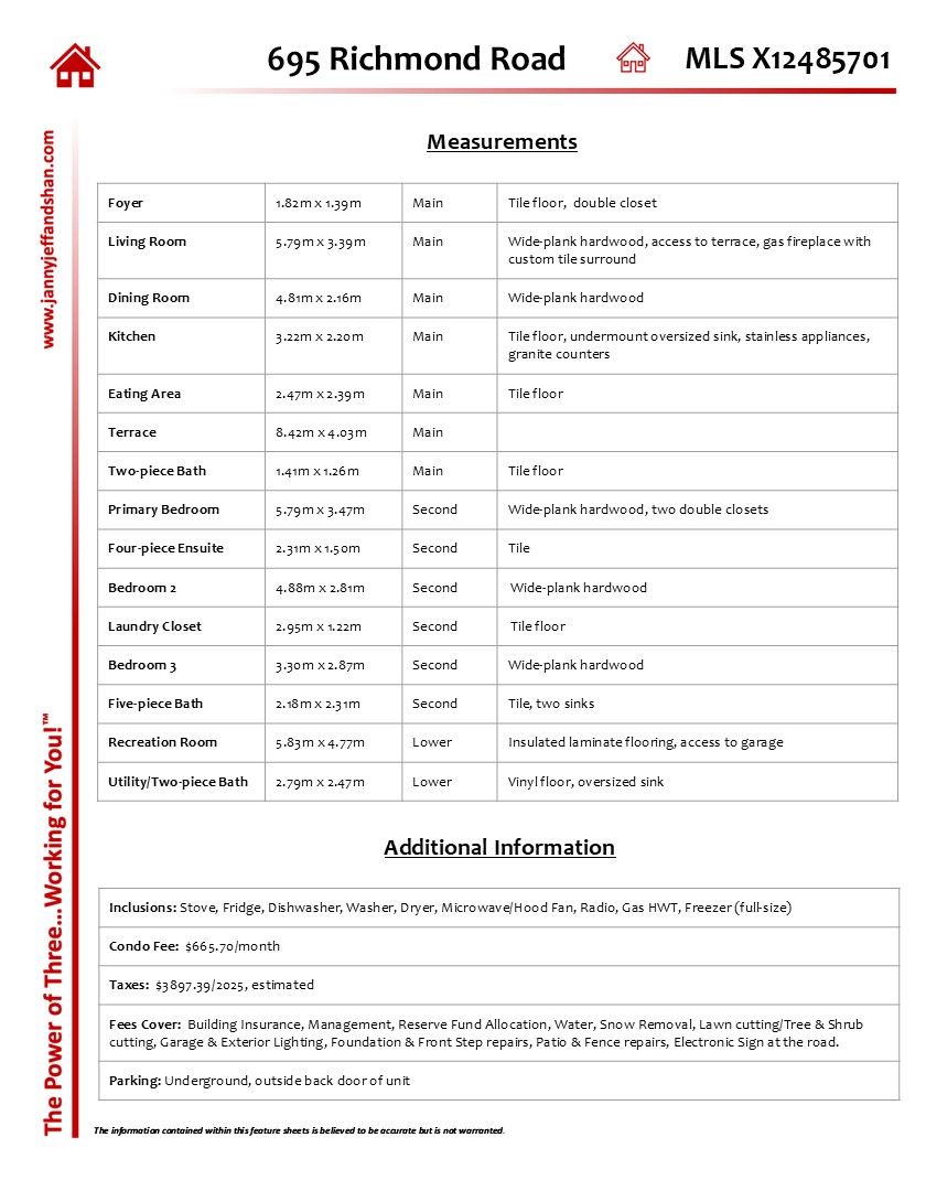 Welcome to this fabulous townhome located just steps to sought-after Westboro-where it all happens! This self-managed complex is well-situated, allowing you to enjoy all the amenities that this popular area has to offer with a seasonal view of the Ottawa River from the primary bedroom. Fantastic main level layout lends itself to easy entertaining, with open concept dining & living spaces, 2pce bath, and a nicely laid-out eat-in kitchen with ample cupboard space, quartz counters, stainless steel appliances, and an oversized undermount sink. The living room features a gas fireplace with custom surround, a wall of windows, and access to the large 27.6ft x 19.8ft (approx.) outdoor terrace-a perfect setting for those who enjoy container gardening & spending their leisure time outdoors. This 3-bed, 4-bath home has been extensively updated with calm, neutral decor and quality materials throughout. There is a four-piece ensuite bath, a five-piece main bath, and two part baths. Wide plank hardwood on main & second levels, Bryant AC, renovated baths & kitchen, flooring, natural gas BBQ hookup, and owned HWT. Recreation room with insulated laminate flooring and combined utility/2-piece bath on the lower level, along with the added convenience of inside access to heated underground parking just outside your back door. Updated windows, patio door, electrical panel, baseboard heaters and thermostats, storm & main entrance doors, second level laundry and much more-full list of updates is available. Easy access to transit, with the future Sherbourne LRT station nearby, plus tons of cafés & restaurants, shopping, schools, and the parkway for walking and cycling along the Ottawa River. Facing the Byron Linear Park and just down the street from the Westboro location of the Ottawa Farmers’ Market every year from May-October, Westboro and Britannia beaches, the Britannia Conservation Area, Champlain Bridge, Tunney’s Pasture, and access to the 417 are all nearby. 24-hour irrevocable