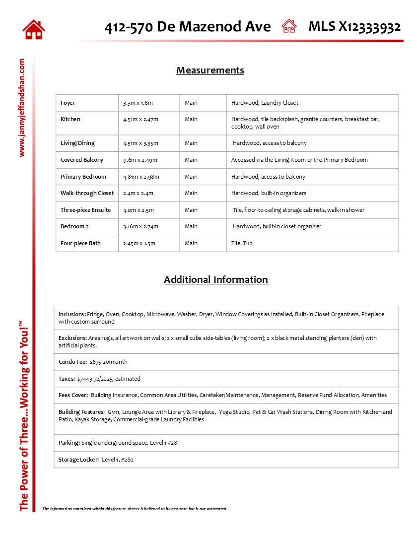 Set between Main Street and the Rideau River, The River Terraces at Greystone Village offers the convenience of being centrally located, while its proximity to the Rideau River and the Rideau Canal provides residents with easy access to nature and recreational pathways. Built by EQ Homes, this 2-bedroom + den, 2-bath Model 20 unit is approx. 1034sq. ft., and is ideal for anyone requiring space for a home office. The huge, covered balcony is approx. 258 sq. ft. and allows you to truly enjoy the warmer months with enough space for dining and seating areas, and includes a gas BBQ hookup. Ample daylight fills the interior space, giving a lively and warm feel throughout. The Primary Bedroom features a walk-through closet with built-in organizers, balcony access, and a spacious ensuite with a large walk-in shower and built-in floor-to-ceiling cabinets. Numerous upgrades including a Liebherr fridge, gas cooktop, dishwasher, and electric fireplace with custom millwork surround. This unit also offers ensuite laundry, neutral décor, hardwood & tile floors, underground parking for one and a storage locker. Condo amenities include a gym, lounge area with a library and fireplace, yoga studio, dining room with kitchen, kayak storage room, pet & car wash stations, plus commercial-grade laundry facilities. Don’t forget the Main Street Farmers Market in Grande Allée Park, every Saturday from May-October. A wealth of diverse amenities are easily accessible, including the Flora Footbridge, uOttawa, Saint Paul University, downtown, the 417, Glebe amenities, Lansdowne Park, CHEO and the General and Riverside campuses of the Ottawa Hospital, plus cafés, services, and restaurants.